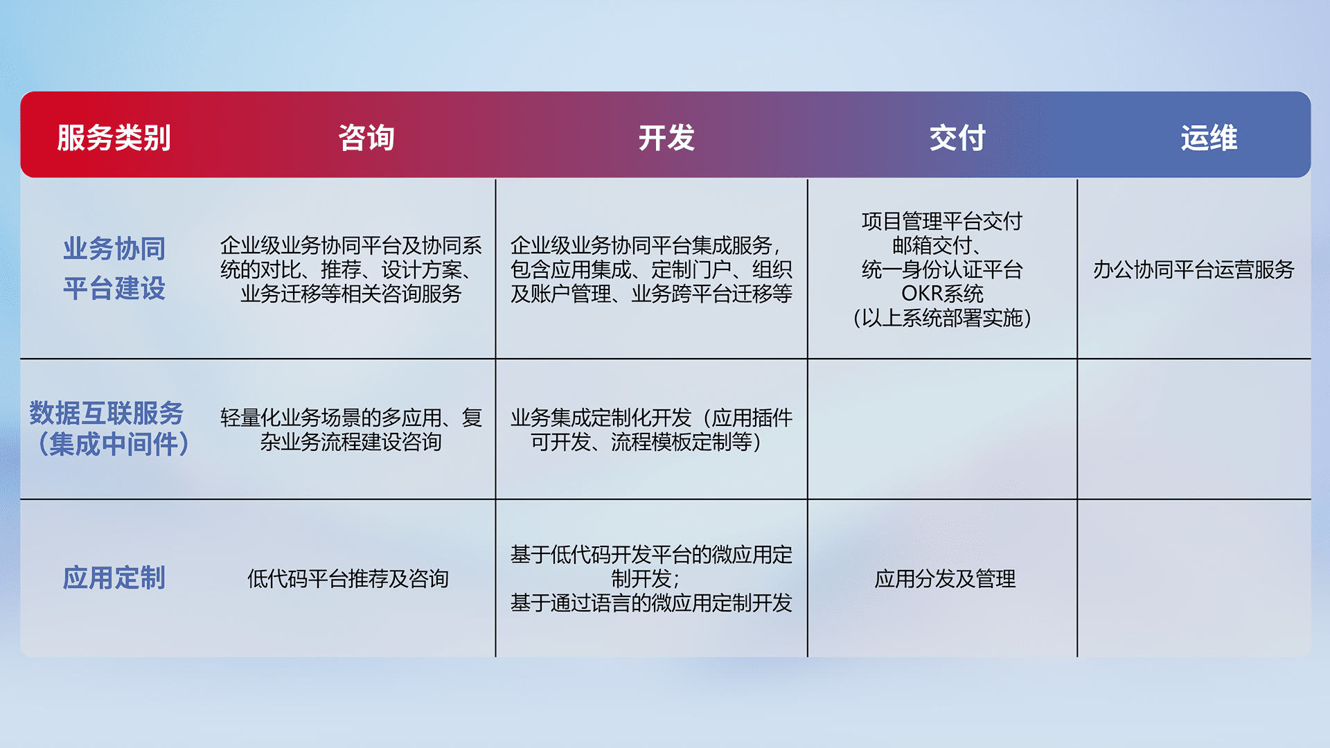 针对钉钉、、企微、、、、IDaas等平台级产品提供产品的规划、、方案、、、、交付、、、定制化开发等服务,,,实现如统一协同办公、、、、智能客户服务、、、混合会议管理、、、、智能数据查询、、等业务场景,,实现数字化转型。。。
